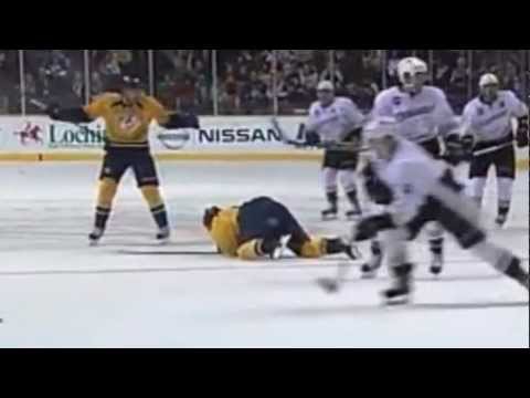 Jarkko Ruutu has long been a player known as “dirty.” Let’s see… he’s had THIS clip on Martin St. Louis, he’s had THIS incident where he bit Andrew Peters and then, of course, he had THIS ridiculously late and dangerous hit on Petr Schastlivy during international competition. So, during game three of the first round, Ruutu found yet another opponent to hit. This hit, coming in open ice, caused Erat to miss the rest of the series. Thankfully, the Preds advanced and Erat would take the ice again. Ruutu, by the way, was suspended one game for the incident.